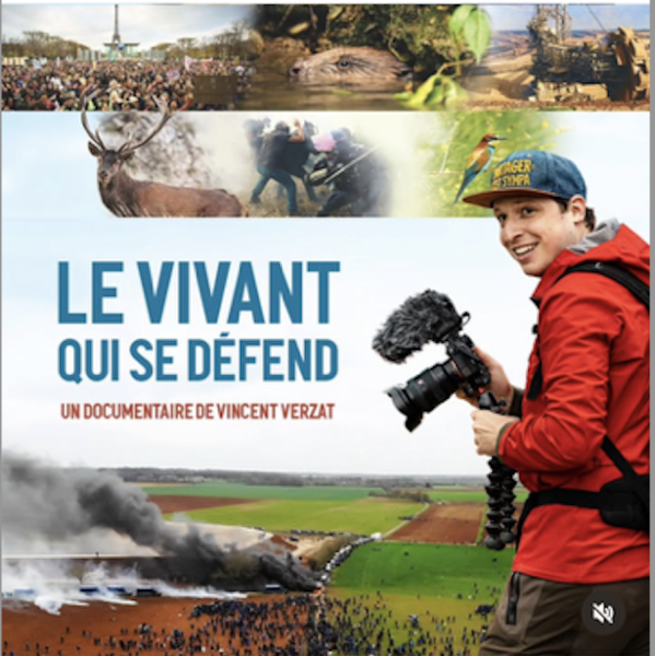 Vincent Verzat filme les mobilisations écologiques depuis 10 ans sur la chaîne YouTube, Partager c'est Sympa. Partant d’un récit personnel et sensible, le film retrace son cheminement entre militantisme et naturalisme, sa recherche d’un équilibre entre combat et contemplation, traçant un chemin pour vivre dignement et affronter ce qui vient. Des luttes forestières du plateau des Millevaches à la tanière d’une famille de blaireaux, en passant par les méga bassines du Poitou, les cerfs du Vercors et l’autoroute A69, "Le VIVANT qui se défend" fait le lien entre les animaux sauvages et les luttes qui sont menées partout en France contre la destruction de leurs habitats. “Le VIVANT qui se défend” trace un chemin pour vivre dignement et affronter ce qui vient.